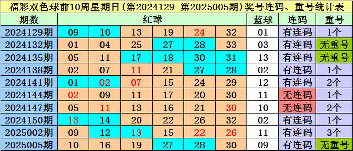 双色球前10周日曜日(第2024129-第2025005期)红球号码频次统计: