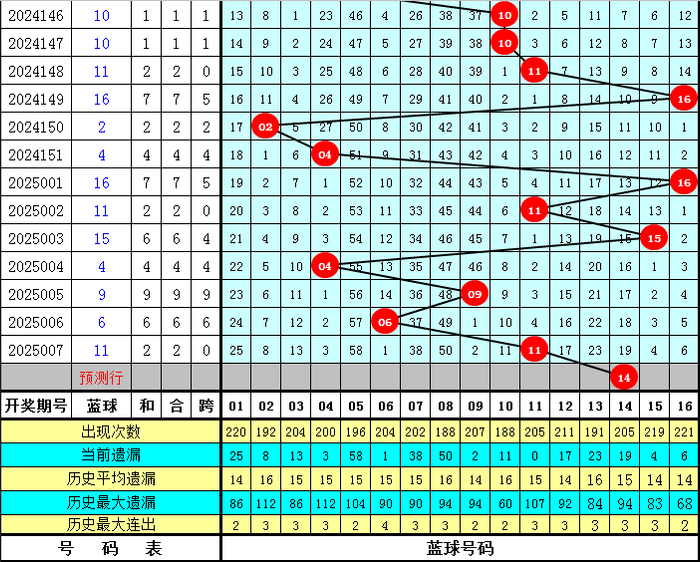 蓝球:最近10周日曜日蓝球号码开出8个,其中蓝球大小比为6:4,012路比为3:3:4,奇偶比为6:4。